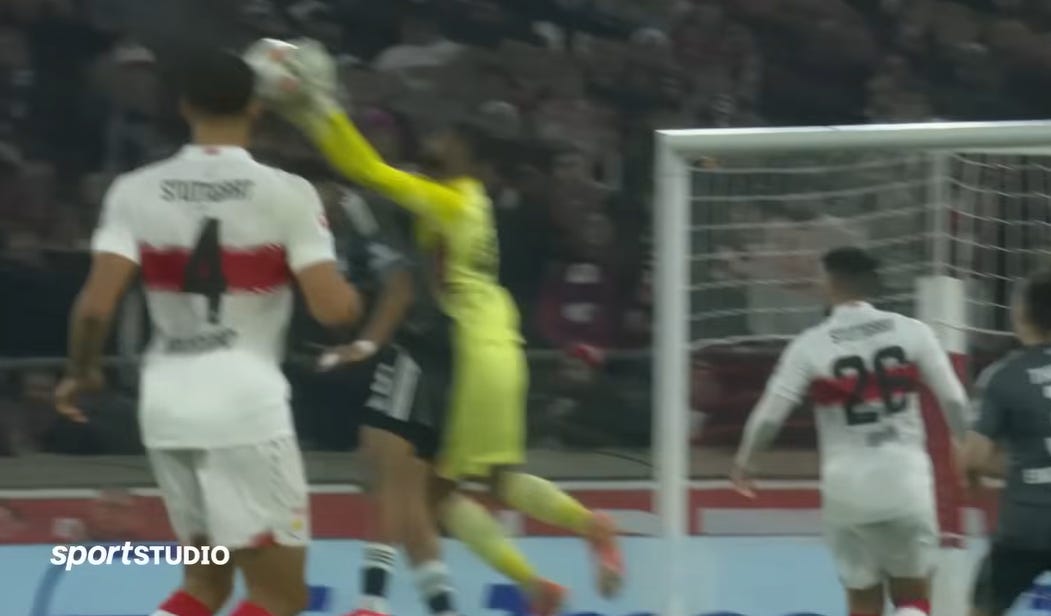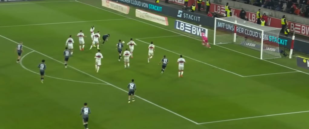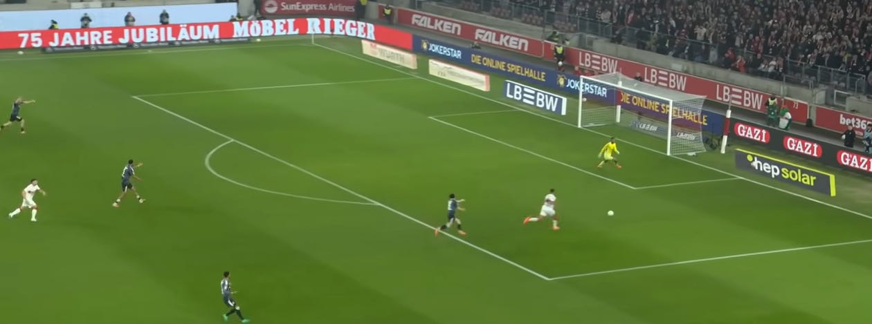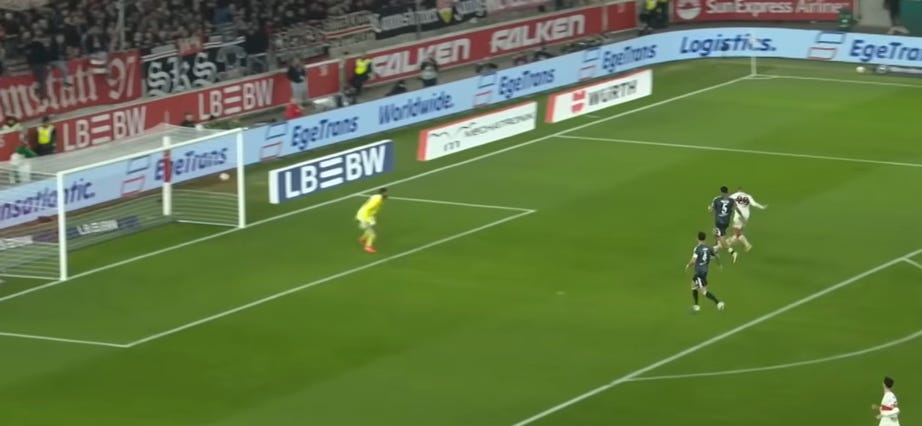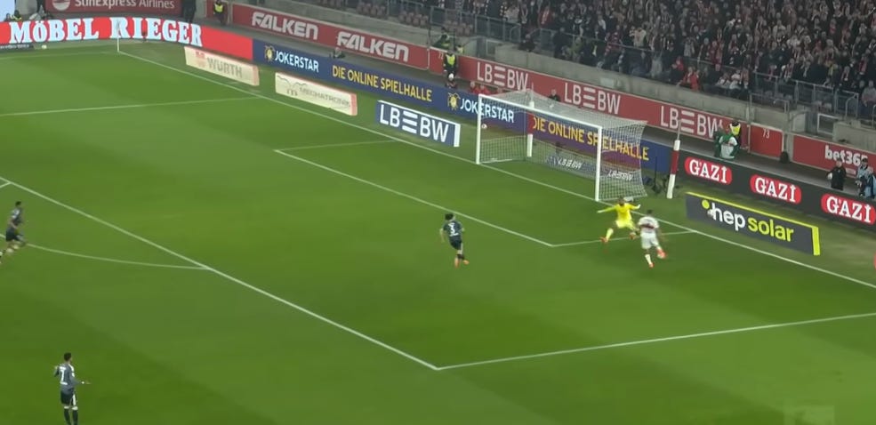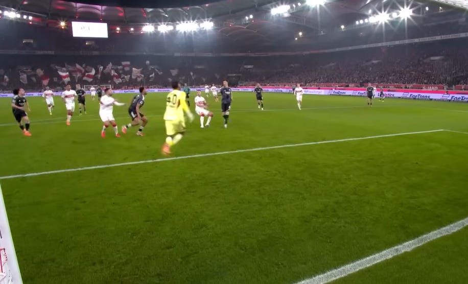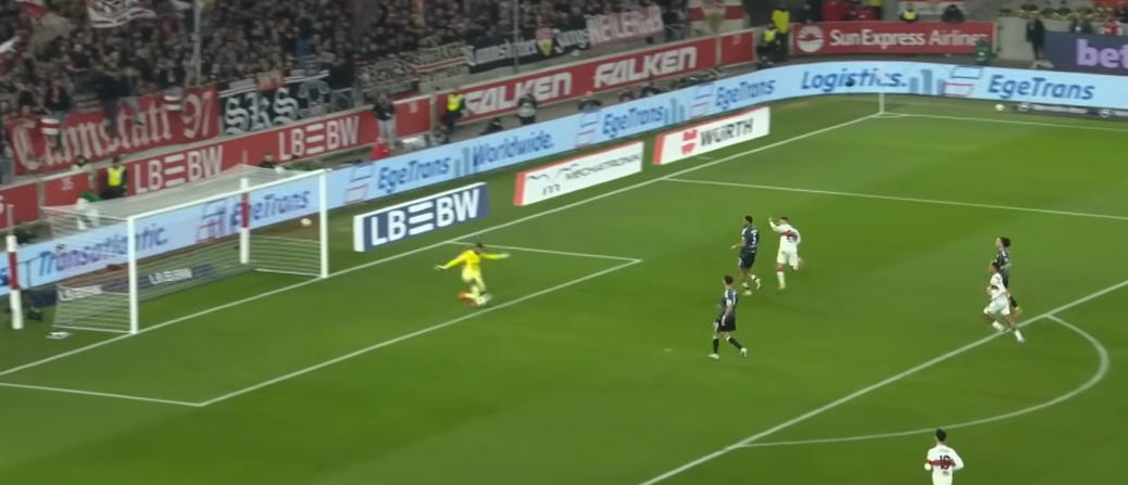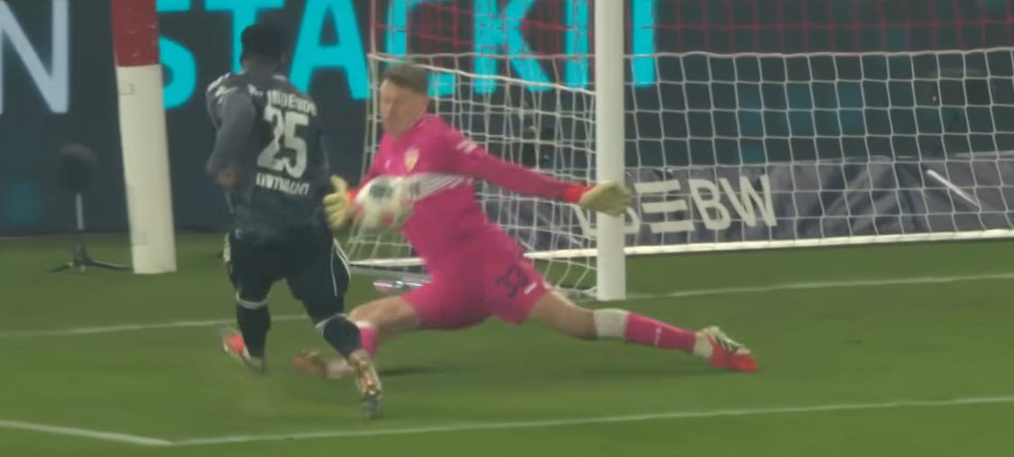 Der VfB-Keeper ist hellwach, als Kalimuendo durchbricht. Wie so häufig stellt er keinen klassischen Block, sondern schiebt “südamerikanisch” in den Schuss. Nübel bleibt dadurch aufrecht, kann die Bewegung schneller einleiten. Top-Aktion und zum zweiten Mal ein starkes Spiel von ihm.