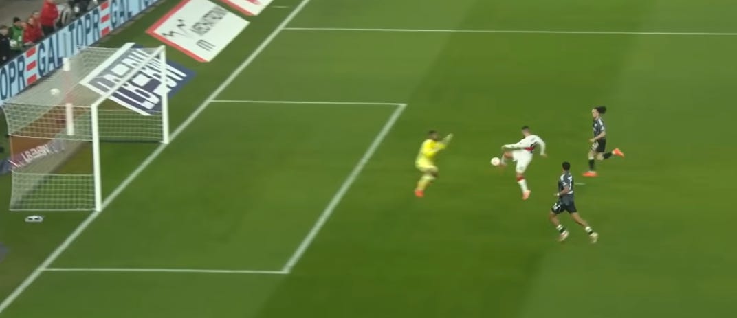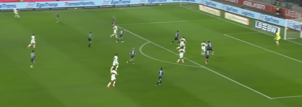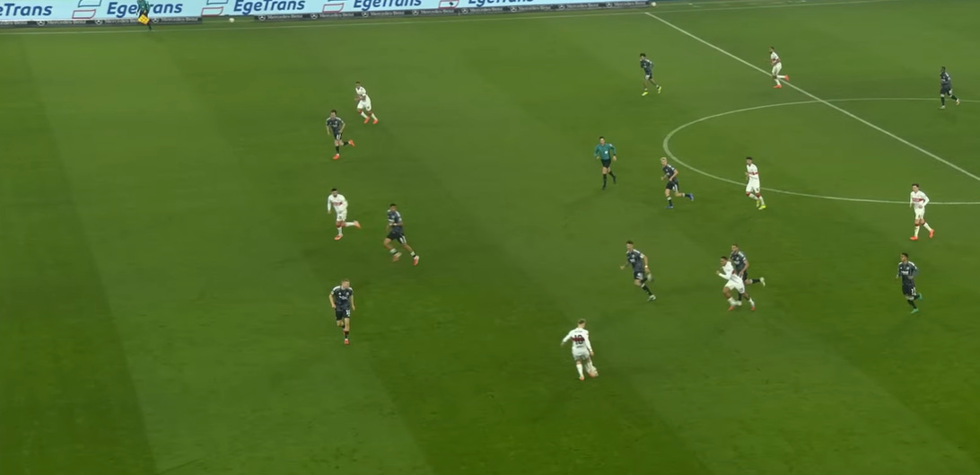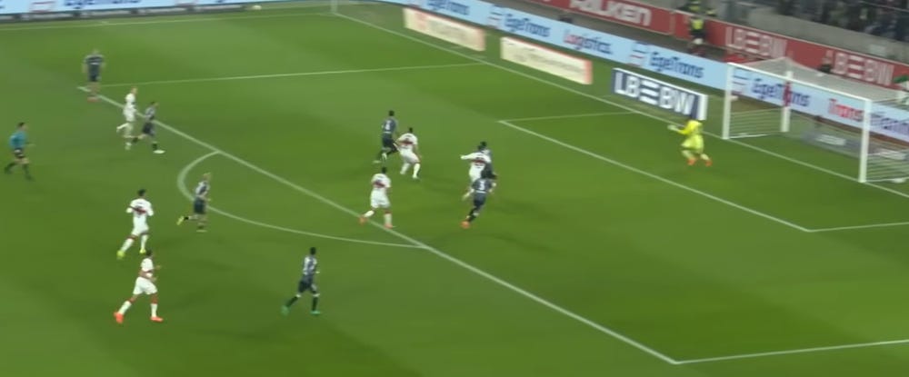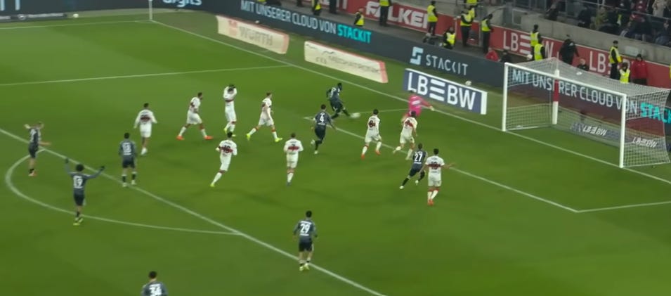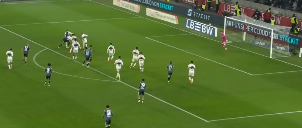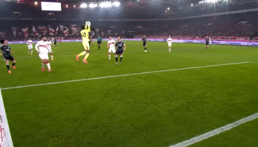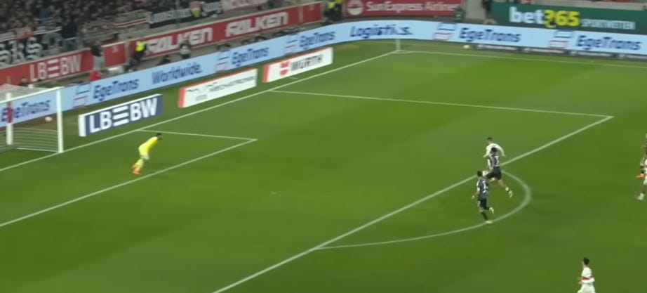 Der VfB-Keeper ist hellwach, als Kalimuendo durchbricht. Wie so häufig stellt er keinen klassischen Block, sondern schiebt “südamerikanisch” in den Schuss. Nübel bleibt dadurch aufrecht, kann die Bewegung schneller einleiten. Top-Aktion und zum zweiten Mal ein starkes Spiel von ihm.