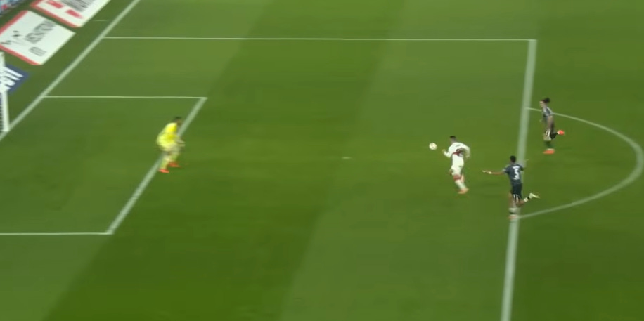 Sicherlich ist ein Kontakt zwischen Santos und Amenda da. Aber es ist auch kein Impact, der einen Profitorhüter so aus dem Gleichgewicht bringen sollte. Abschließend war es für mich auch ein Ball zum Fangen. Er war lang genug in der Luft, er war klar eher da - Fausten wäre möglich, aber nicht notwendig gewesen.