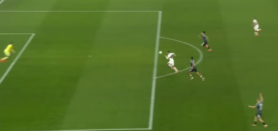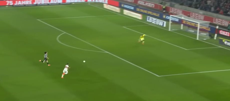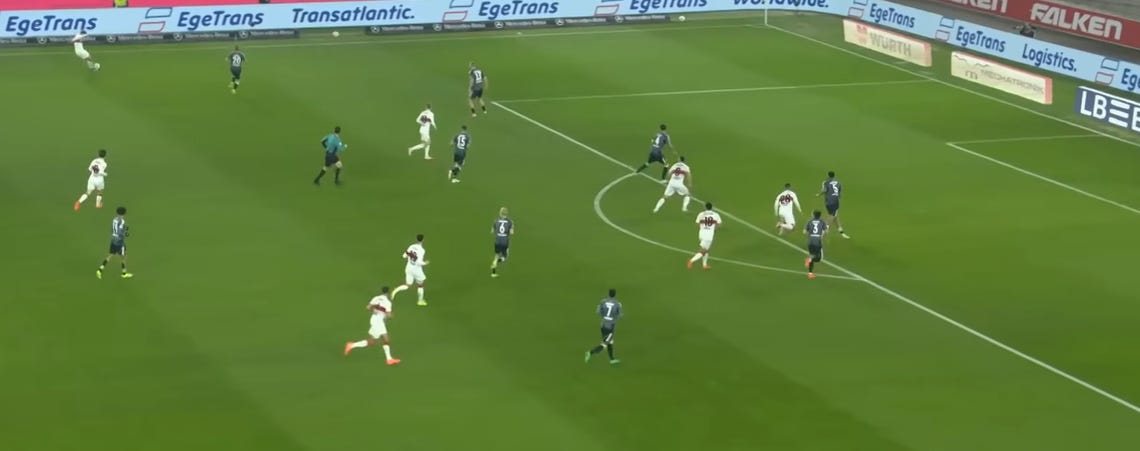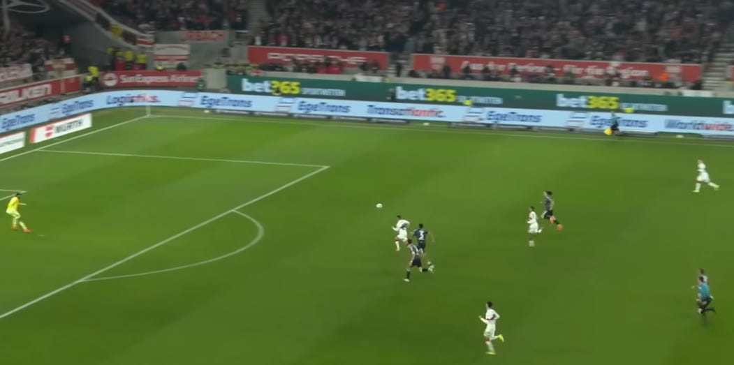 Mal abgesehen davon, dass ein langer Pass die gesamte Fünferkette aushebelt und Kauffs (7) Gegenspieler Vagnoman frei durch ist, hätte Santos bei seinem ersten Gedanken bleiben müssen. Mit einer leicht höheren Position kann er den Ball sicher klären.
