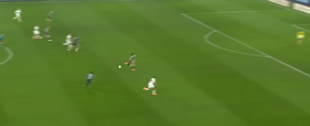 Hier gut zu sehen, wie er sich nach einem Kreuzschritt nicht direkt mit dem rechten Bein abdrückt, sondern auch mit dem linken. Dadurch ist der Sprung einerseits nicht sonderlich hoch. Andererseits bekommt er sein linkes Knie nicht hoch, um sich zu schützen bzw. den Gegen-/Mitspieler auf Distanz zu halten.