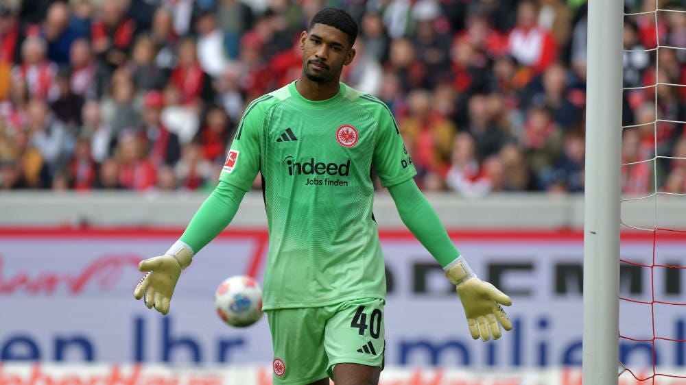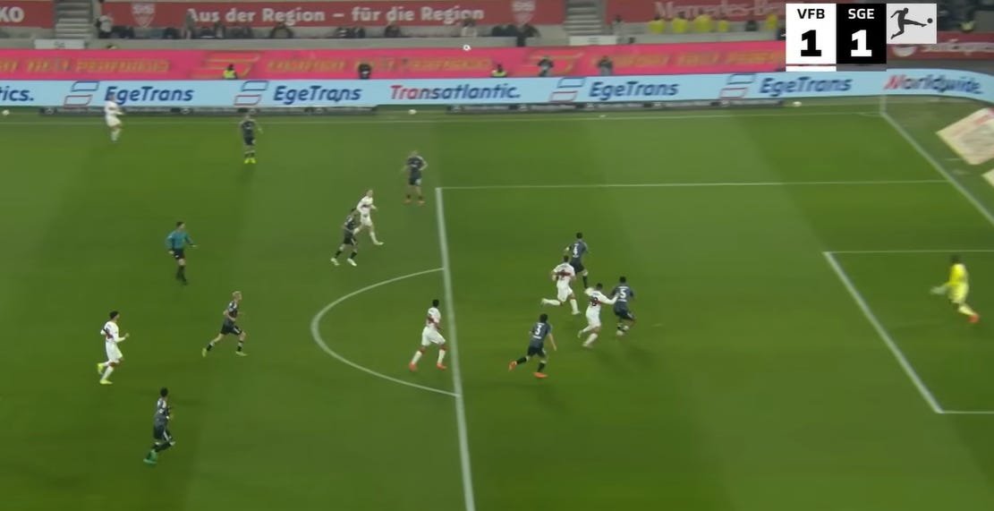 Erwähnenswert ist vor allem diese Szene: Langer Ball, leicht diagonal aus der Stuttgarter Hälfte. Santos steht initial schon zwei bis drei Meter zu tief. Kommt dann erst raus, geht wieder zurück, um dann aus spitzem Winkel drauf zu schieben. Gleich vier Frankfurter gestikulieren mit den Armen aufgrund dieses uneindeutigen Verhaltens.
