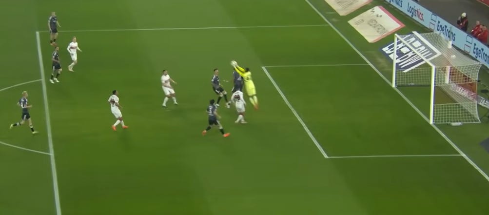 Mir gefällt wie lange er aufrecht bleibt und Undav mit kleinen Schritten entgegengeht. Bei springenden Bällen ist die Gefahr groß, überlupft zu werden, wenn man herausstürmt. Santos macht das gut, bewahrt die Ruhe und nimmt Undav mit jedem Schritt mehr Optionen.